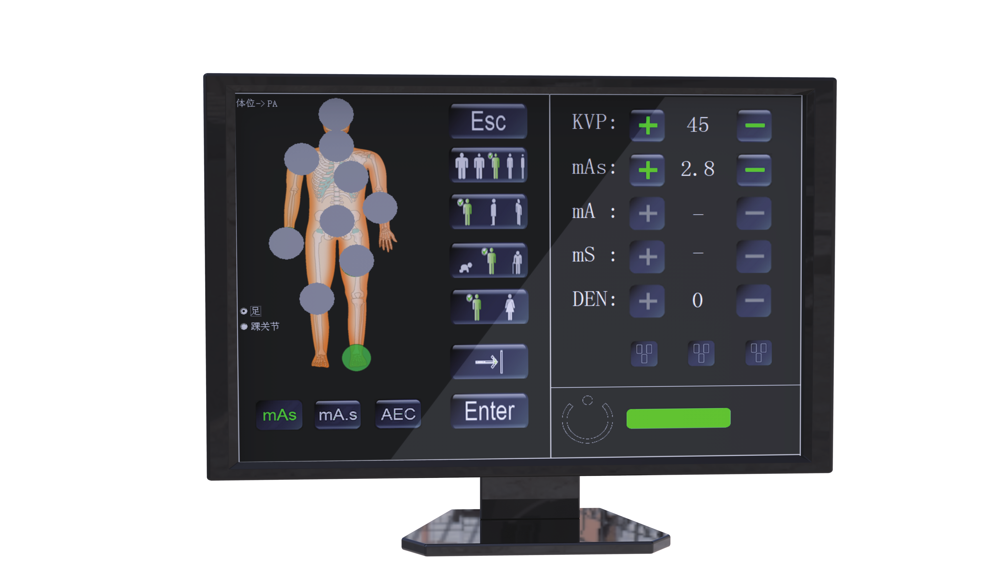 ● 支持kV. mAs兩鈕制、kV. mA. s三鈕制及AEC自動曝光三種攝影模式,能更好的滿足不同用戶的使用需求。